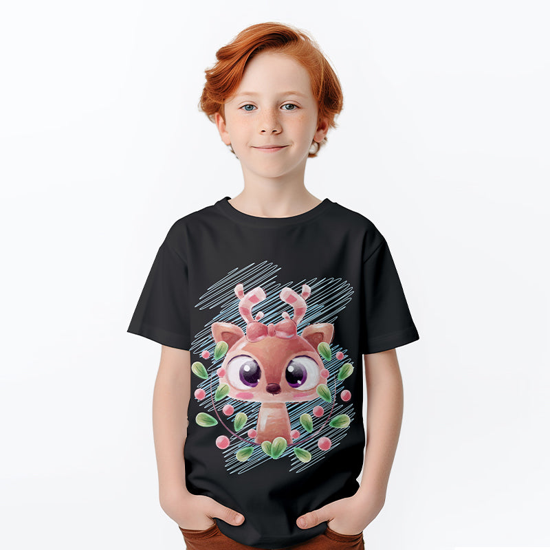 Add a touch of magic to your child's wardrobe with the Berry Deer Dream Tee from TrendyRoys. This black t-shirt features an irresistibly cute cartoon deer with big sparkly eyes, surrounded by colorful berries and leaves on a playful scribble-style background. Crafted from soft, high-quality fabric, it’s perfect for kids who love woodland wonders and standout style!